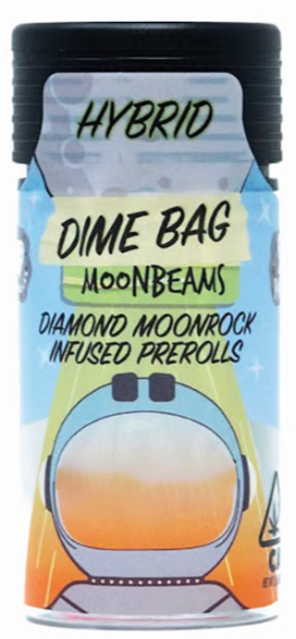 Prepare for liftoff with Dime Bag Moonbeams! This 1 gram diamond moonrock-infused preroll is like a cosmic journey for your senses. Crafted from premium whole nug flower infused with liquid diamonds, terps, and kief, each joint reaches stratospheric potencies while delivering an unbelievably smooth and flavorful smoking experience.